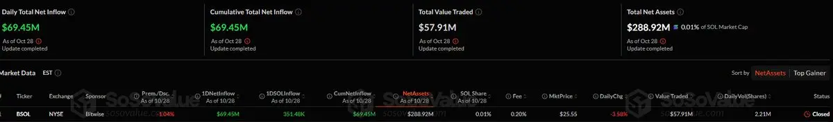 ビットワイズソラナステーキングETF (ティッカー: BSOL)は、明確な先頭を切り、初日の流入が6945万ドルを集め、2025年のETFデビューにおける最高の初日取引量を記録しました。