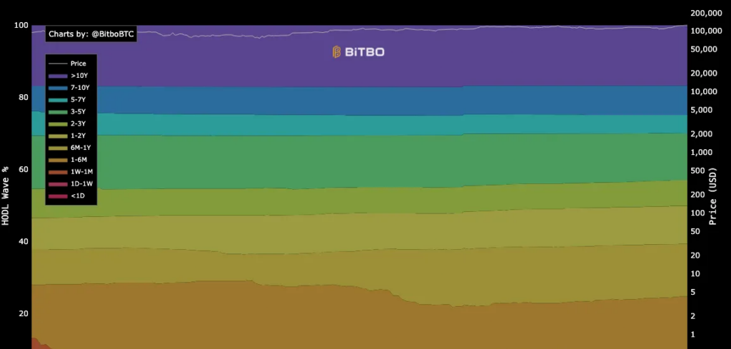 最新のHODL Waves分割では、7~10年が約8%、5~7年が約5%、3~5年が約13%、2~3年が約7%、1~2年が約11.5%、6~12ヶ月が約13%、3~6ヶ月が約7.5%、1~3ヶ月が約9.5%、そして1ヶ月未満が約5%となっています。