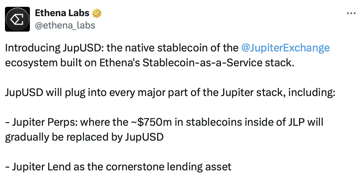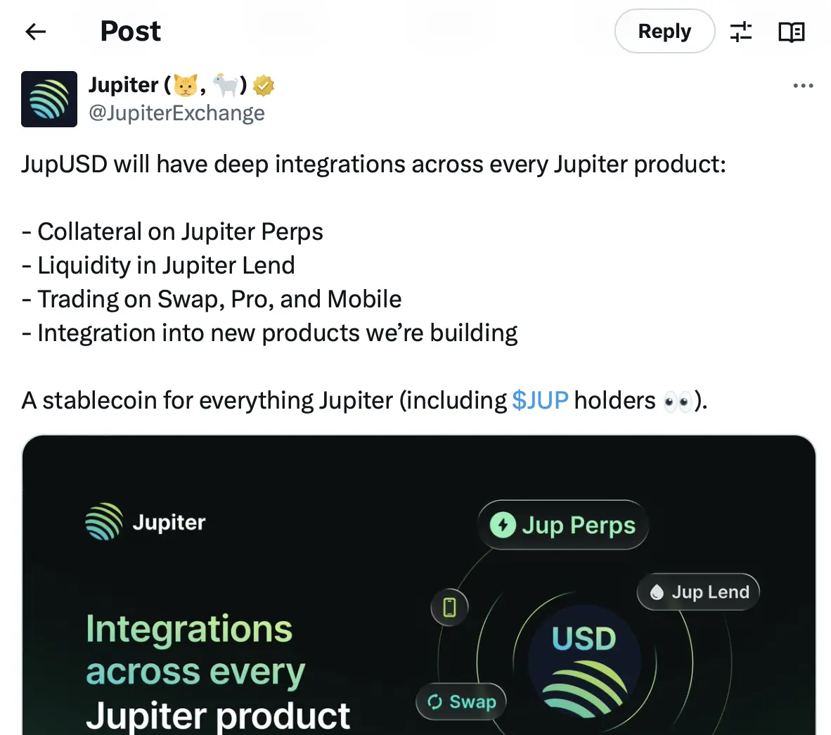 ジュピターによると、ステーブルコインはEthena LabsのUSDtbによって100%担保される予定であり、これは短期の米国財務省資産に裏付けられたドルペッグトークンです。時間が経つにつれて、Ethenaの合成ドルであるUSDeが担保として追加され、利回り率の最適化が図られます。