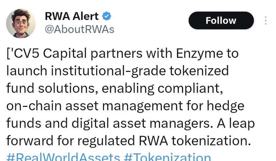 ソース: DefiPlanet オリジナルタイトル:CV5キャピタルがエンザイムと提携し、機関投資家向けトークン化ファンドを立ち上げ 元のリンク: