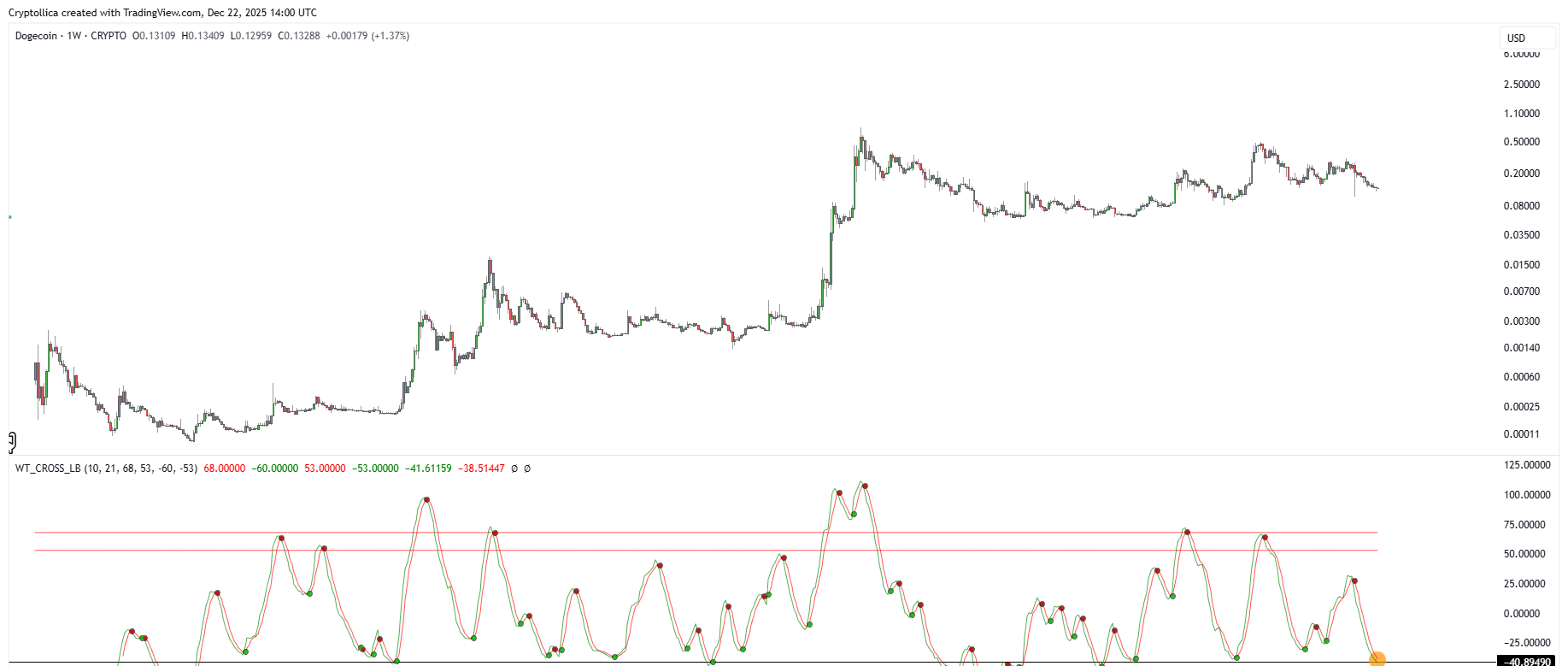 では、チャートが予言のように見えなくても、トレーダーの素朴な言葉で何を意味するのか?Cryptollicaは、DOGEが「買いゾーン」に戻ったと高い確信を持って週足タイムフレームで主張しており、RSIは歴史的な底値付近にあり、過去のサイクル設定に似た丸みを帯びた底を形成しているとしています。