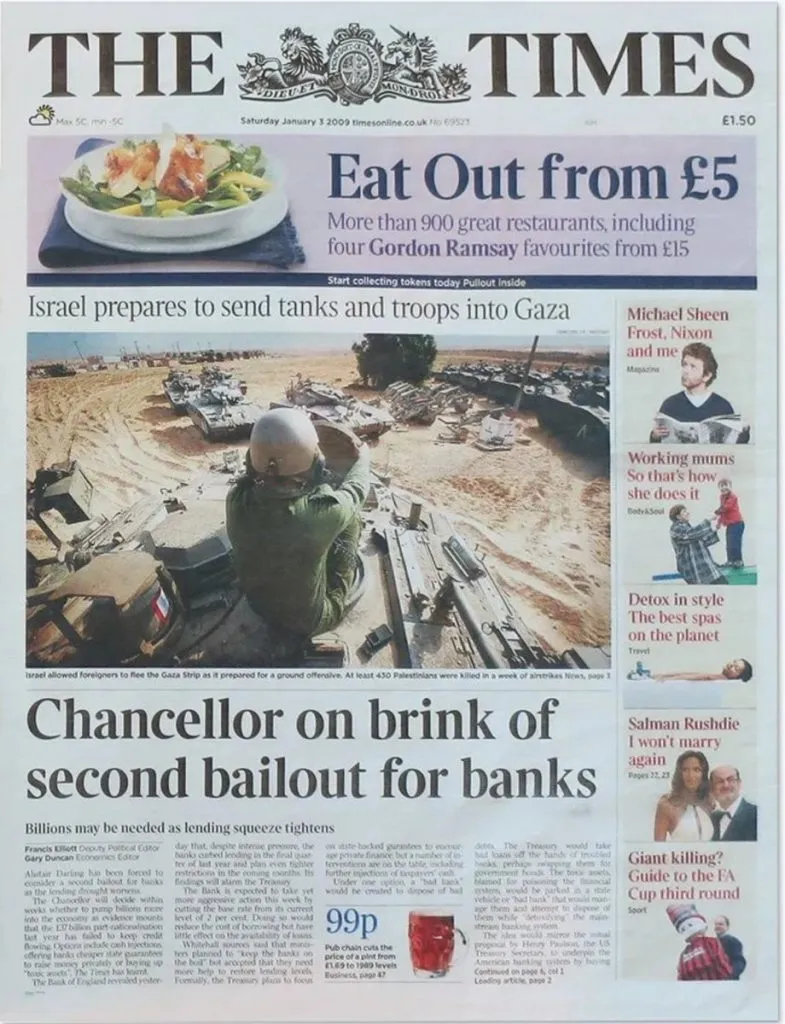 そのハッシュには、イギリスの新聞The Timesの記事タイトル 「Chancellor on brink of second bailout for banks」 が含まれています。