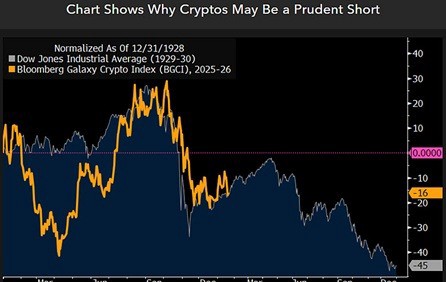 さらに付け加えました:「1月22日までで約16%下落したブルームバーグギャラクシー暗号指数(BGCI)は、96年前に始まった同期間のダウ・ジョーンズ工業株平均と一致しています。」この比較を警告信号として位置付け、投機的資産と過熱した株式市場との長期的な相関関係は、歴史的に急激な反転を先行させるものであり、ソフトランディングではなく逆転を示唆していると強調しました。