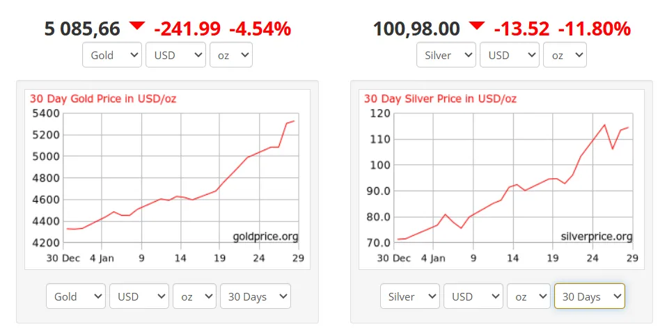 1月末は貴金属のパラボリックな上昇で幕を開けました。週初めに$5000の壁を突破した後、金はインertial(慣性)を持った動きで、1月28日に史上最高の$5200超えを記録しました。銀はさらに爆発的な動きを見せ、$117.69まで急騰しました。