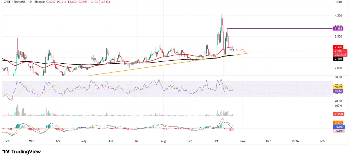 相反,如果CAKE能夠恢復並在50日EMA線上收盤(2.94 USD),買入力量可能會再次被激活,爲10月14日達到3.88 USD的高點提供機會。