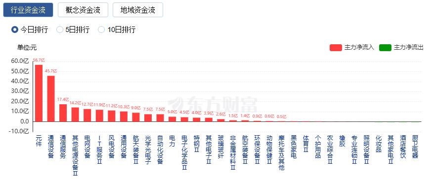 As of the close, net inflows were seen in sectors such as components, communication equipment, and communication services, with components leading at 5.666 billion yuan.