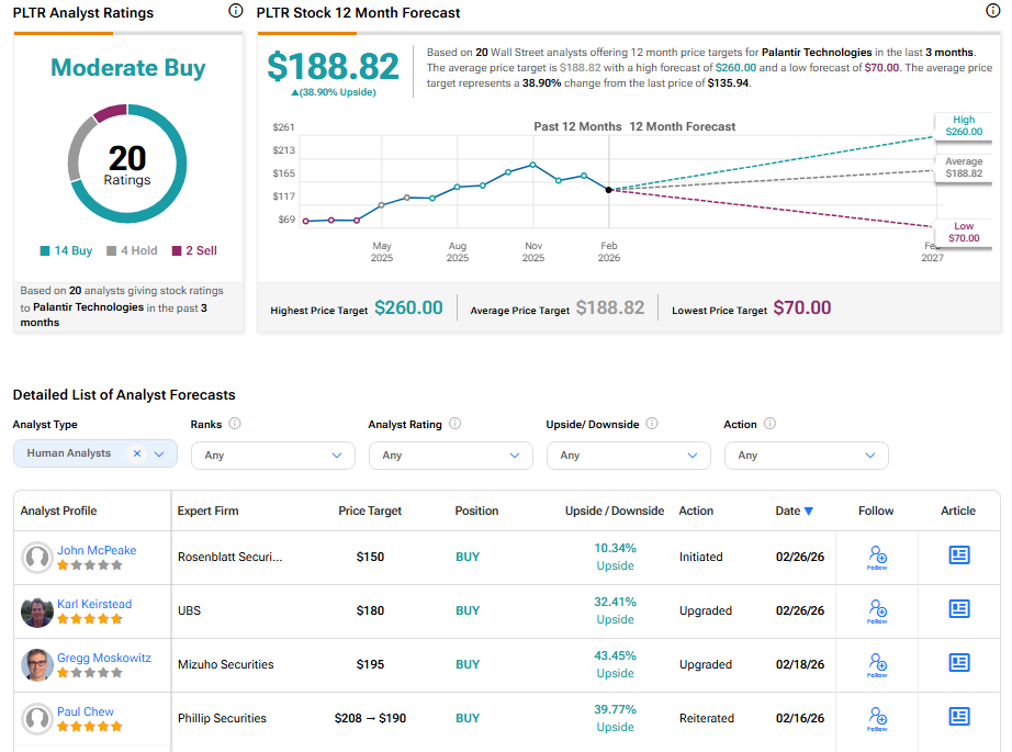 Overall, PLTR carries a Moderate Buy consensus rating on Wall Street, based on 14 Buys, four Holds, and two Sell recommendations. The average PLTR stock price target of $188.82 implies 38.90% upside risk from current levels.