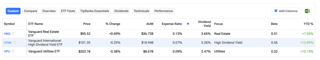 Dividend investing remains one of the simplest ways to build steady passive income — especially in a volatile market. Instead of chasing hot stocks, many retail investors prefer reliable cash flow from established companies that pay consistent dividends. That’s where Vanguard stands out with several dividend ETFs designed to deliver income without excessive risk. Using TipRanks’ Best Vanguard ETFs tool, we identified three income-focused options: Vanguard Real Estate ETF VNQ +0.69% ▲ , Vanguard International High Dividend Yield ETF VYMI -0.25% ▼ , and Vanguard Utilities ETF VPU -0.38% ▼ .