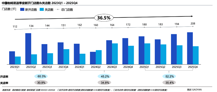 According to Gao Yan’s data, the number of coffee stores in China has maintained strong growth since Q3 2024, with a compound annual growth rate of 36.5% over the past two years.