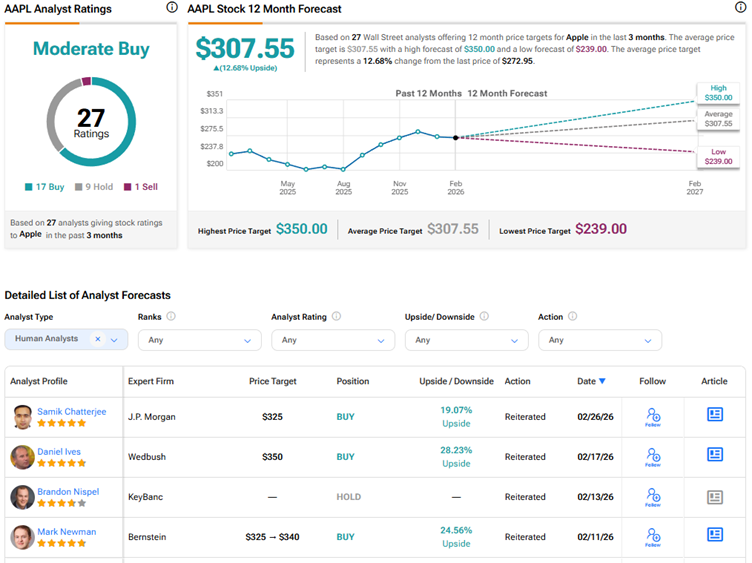 Currently, Wall Street has a Moderate Buy consensus rating on Apple stock based on 17 Buys, nine Holds, and one Sell recommendation. The average AAPL stock price target of $307.55 indicates 12.7% upside potential.