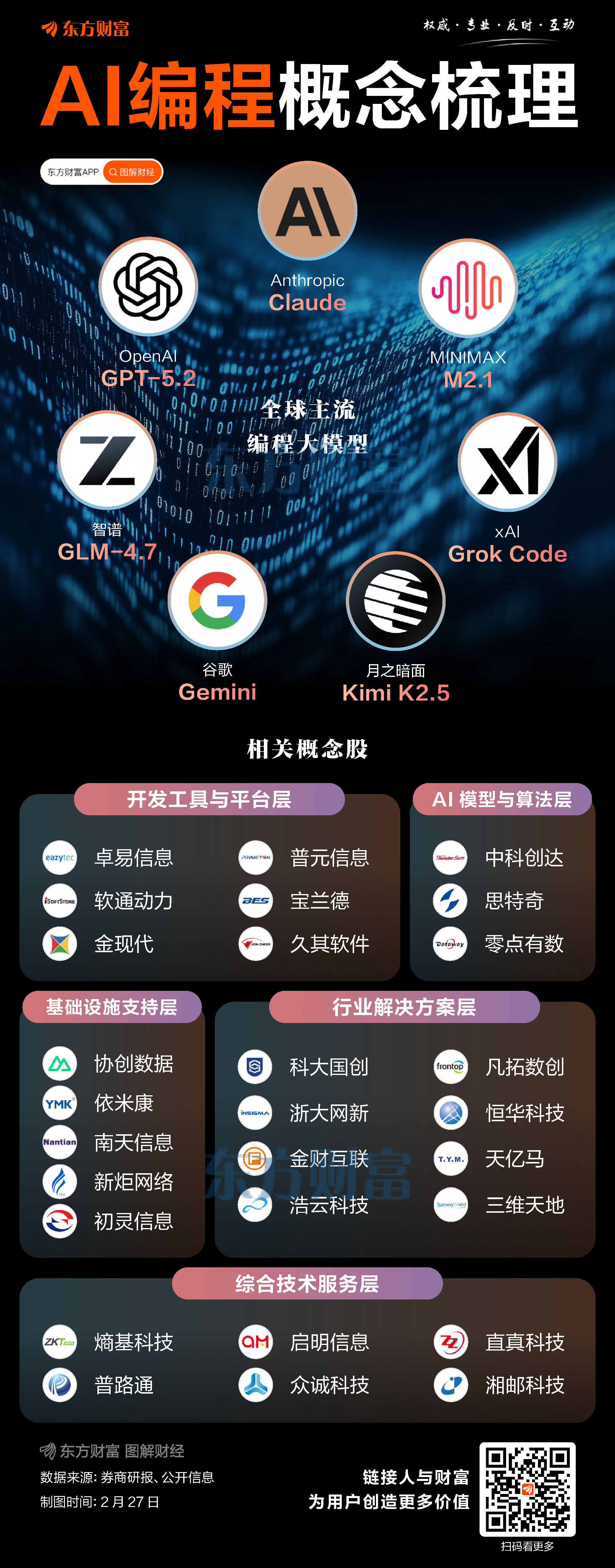 The AI programming sector performed strongly on February 27, with Pu Yuan Information, Jin Modern, and Xin Ju Network hitting the daily limit; Hao Yun Technology and Zhongcheng Technology surged over 10%.
