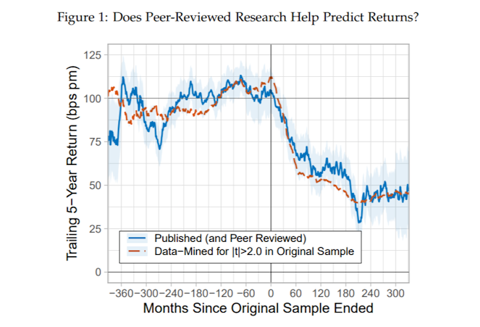 Post-sample, the performance of both types of predictors decays to about 50 per cent of the original sample means. Data-mined returns decay a bit more than the published returns but the difference is small, both economically and statistically. For most of the plot, the data-mined benchmark is within one standard error of the published predictors . . . the post-sample performance of peer-reviewed and data-mined predictors is remarkably similar.