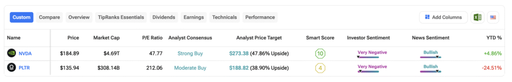 Two of Wall Street’s hottest AI stocks, Nvidia NVDA -5.46% ▼ and Palantir Technologies PLTR +1.30% ▲ , reported earnings this month — and both beat expectations. But which one is the better buy right now? Using TipRanks’ Stock Comparison Tool, we have compared NVDA and PLTR to see which stock offers higher upside to investors. Nvidia stock currently has a Strong Buy rating, with an average price target of $273.38 — implying about 48% upside from current levels. In comparison, PLTR has a Moderate Buy consensus, with a price target of $188.82, suggesting an upside of 39%.