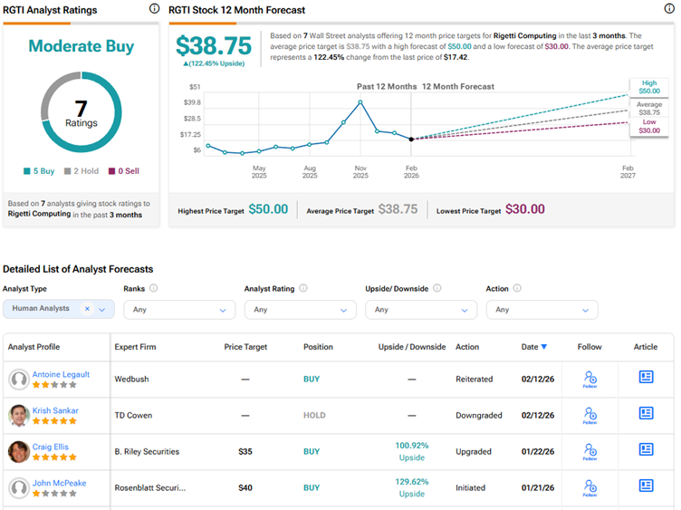 Ahead of Q4 2025 earnings, Wall Street has a Moderate Buy consensus rating on Rigetti Computing stock based on five Buys and two Holds. The average RGTI stock price target of $38.75 indicates 122.5% upside potential.
