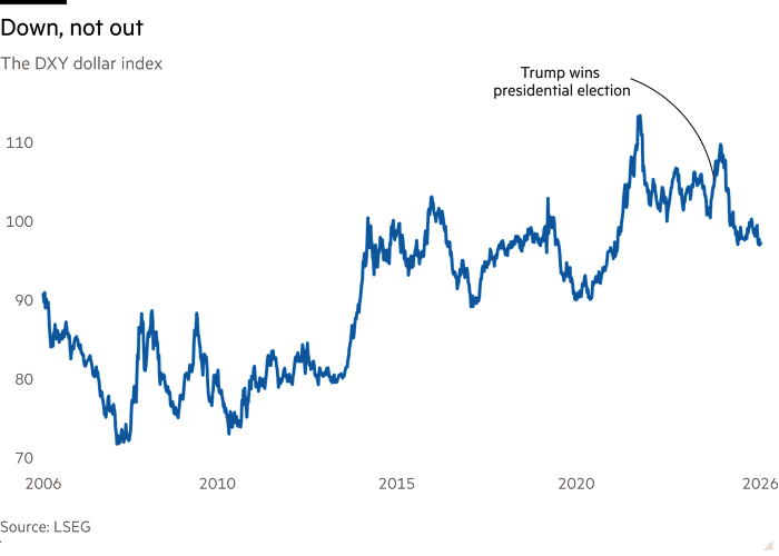 The dollar is down 1.3 per cent this year against a basket of peers including the euro and the pound — on top of a 9 per cent drop in 2025 — and is hovering close to a four-year low.