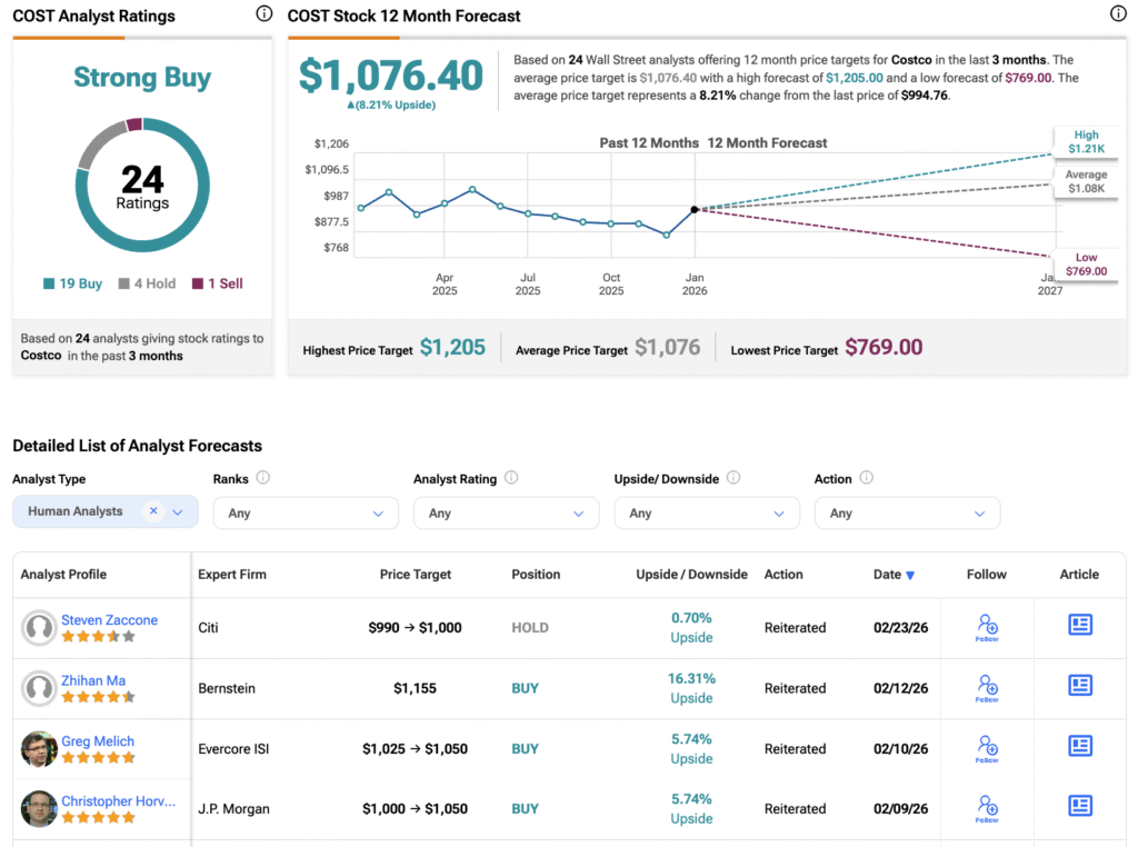 The sell-side consensus on Costco remains very bullish. Of the 24 ratings on Costco stock issued over the past three months, 19 are Buy, four are Hold, and only one is Sell, for an analyst consensus rating of Strong Buy. The average price target stands at $1,076.40, recently lifted by several upward revisions, implying an upside potential of 8.21% from the current share price.