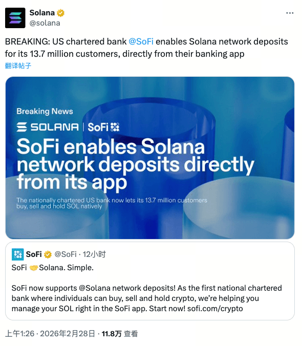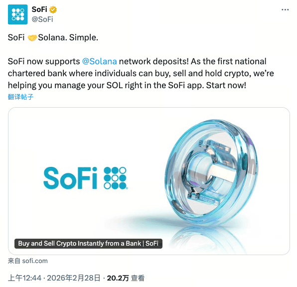 On February 27, 2026, mid-sized digital bank SoFi officially announced support for direct on-chain deposits on the Solana (SOL) network. This seemingly routine feature update quickly drew industry attention because of its identity: SoFi is not an ordinary crypto service provider but a financial institution holding a nationwide charter bank license issued by the U.S. Office of the Comptroller of the Currency (OCC). This means that SoFi’s 13.7 million users can now receive SOL tokens directly from external wallets within a federally regulated banking app and manage them alongside traditional checking and savings accounts.