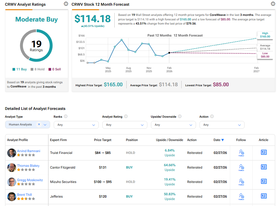 Turning to Wall Street, CRWV stock has a Moderate Buy consensus rating based on eleven Buy and eight Hold ratings. The average CoreWeave stock price target of $114.18 implies 43.51% upside potential.