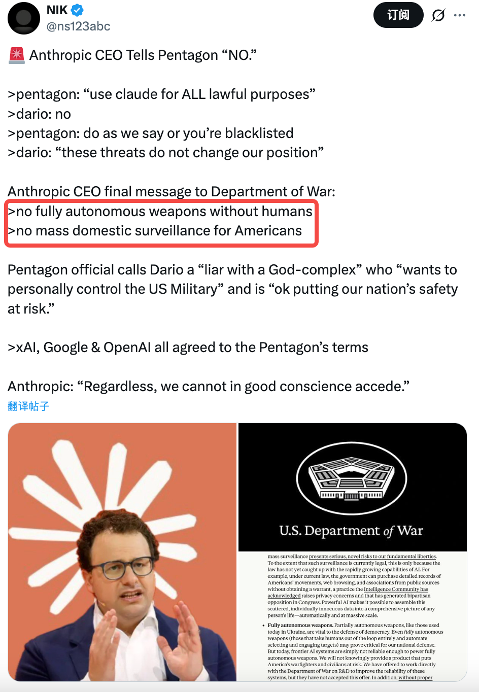 Same principles, same red lines—Anthropic, demanding an extra layer of safeguards, choosing the wrong side and misjudging the situation, was branded as a national security threat on par with Huawei.