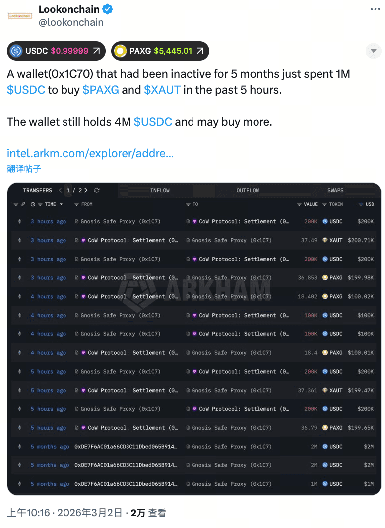According to Gate data, as of March 2, 2026, Tether Gold (XAUT) was priced at $5,379.3, up 1.57% in 24 hours; PAX Gold (PAXG) was at $5,432.9, up 1.49%. On-chain data further confirms this trend: Lookonchain, an on-chain analysis firm, detected an inactive wallet spending $1 million USDC to buy PAXG and XAUT; another Ethereum whale exchanged 1,000 ETH (about $1.94 million) for XAUT, incurring over $60,000 in losses. Additionally, London-based asset manager Abraxas Capital Management received 28,723 XAUT tokens from Tether Treasury, worth up to $151 million—the largest XAUT transaction recorded in the past three weeks.