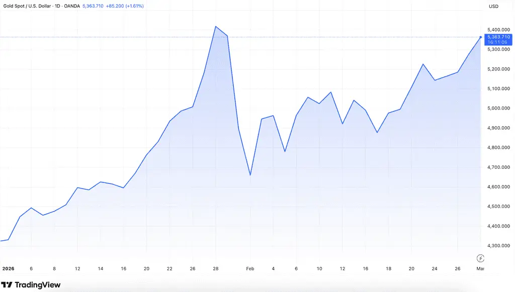 When weekend geopolitical black swan events impact global markets, the closure of traditional financial markets leaves countless investors in a deadlock of “unable to trade.” On February 28, 2026, the US and Israel’s airstrikes on Iran broke the weekend calm, causing spot gold to surge above $5,400 after the market opened on March 2. However, amid this risk-off wave, a subtle but crucial shift is occurring: funds are not entirely following traditional paths but are significantly flowing into tokenized gold—XAUT and PAXG—in the cryptocurrency world. This is not just an asset transfer but a microstructure stress test for the market.