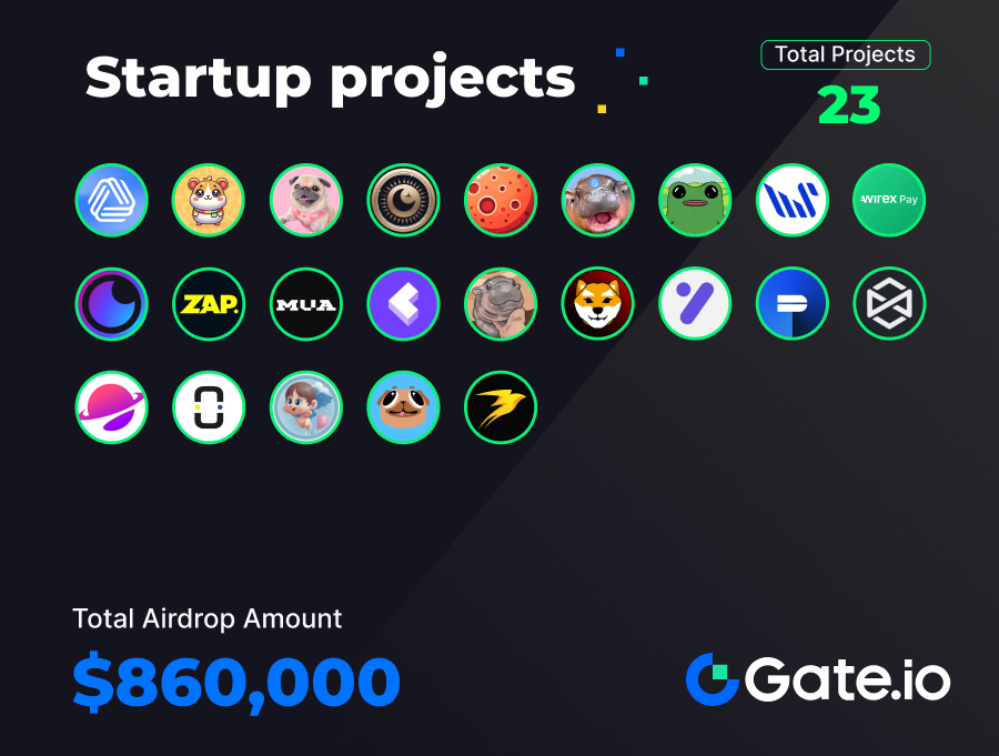 De 1 a 15 de outubro de 2024, a Gate lançou 30 novos projetos e 32 projetos de Startup com um valor total de airdrop de $860.000.