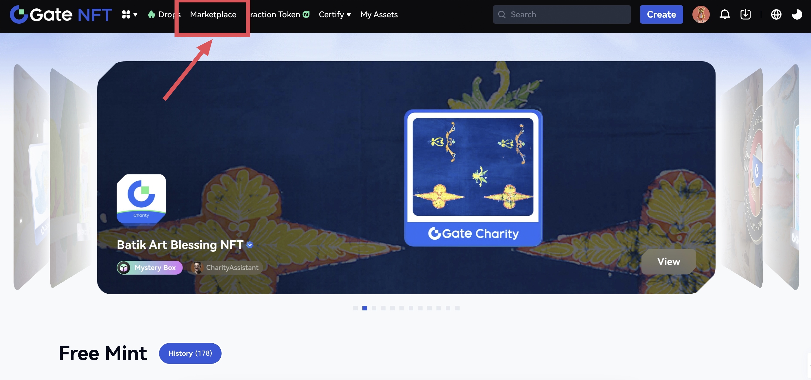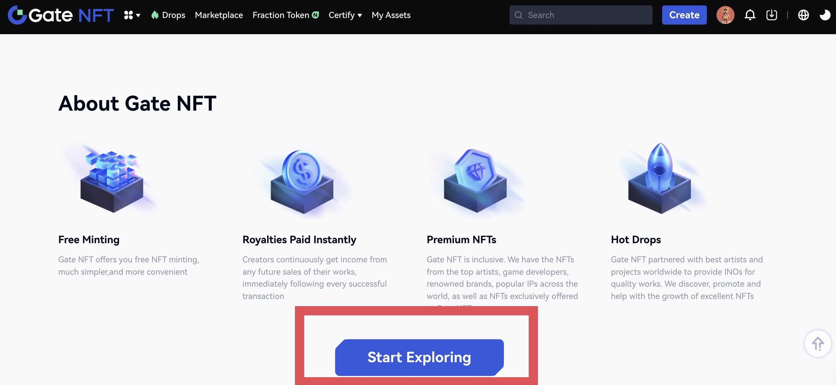 Vá até a página inicial do NFT e clique no botão “Marketplace” ou “Iniciar Exploração”.