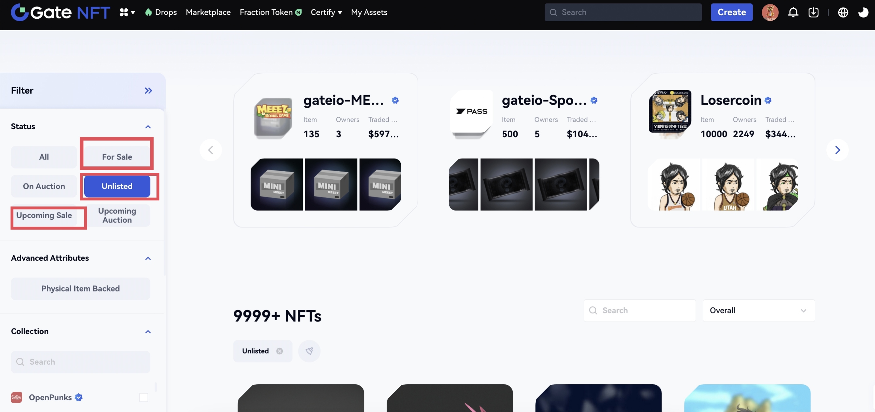 Clique no botão “Filtro” e selecione a opção “Para Venda”, “Não Listado” ou “Venda Futura” para encontrar os produtos disponíveis para lance no mercado Gate NFT.