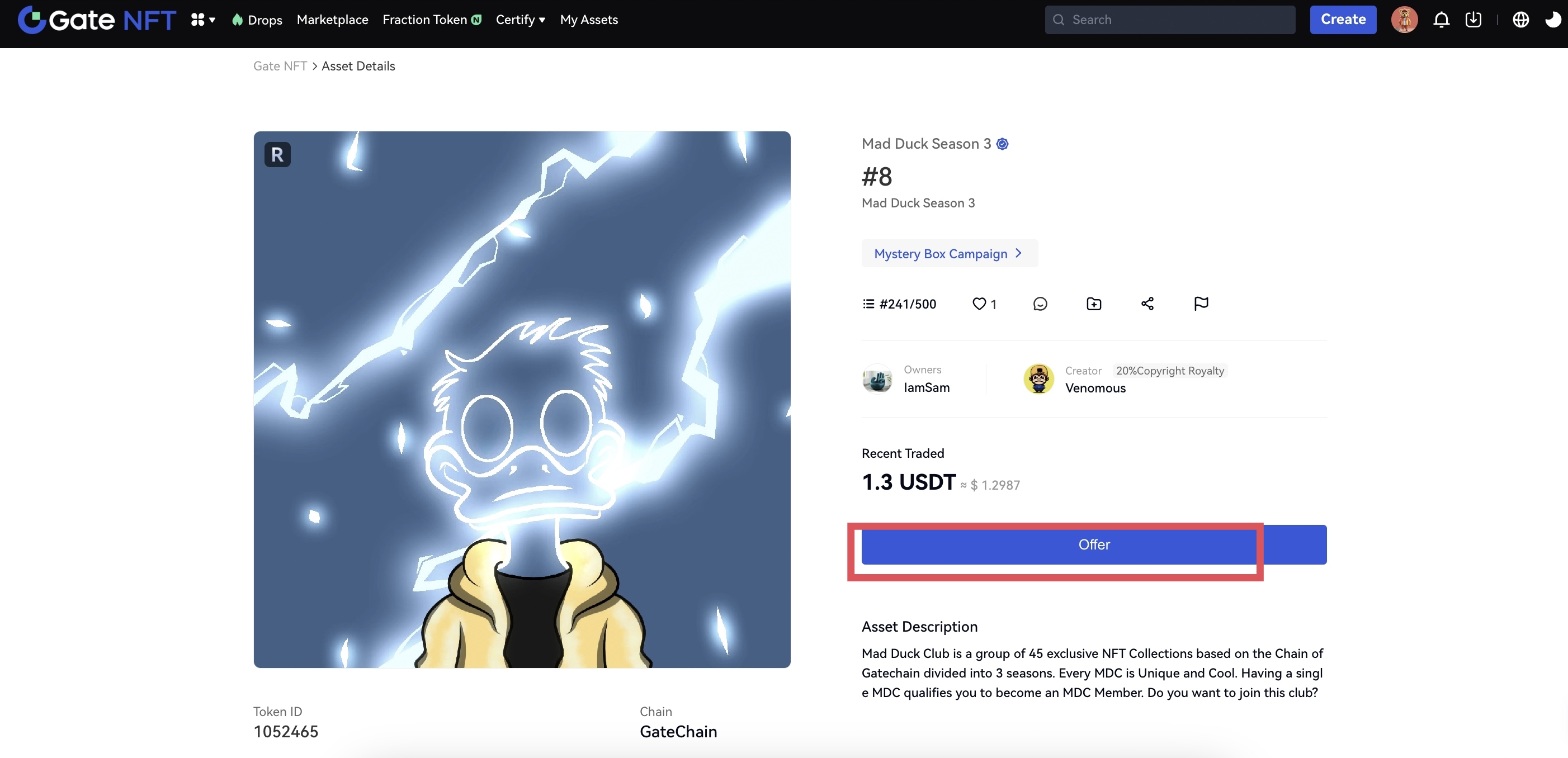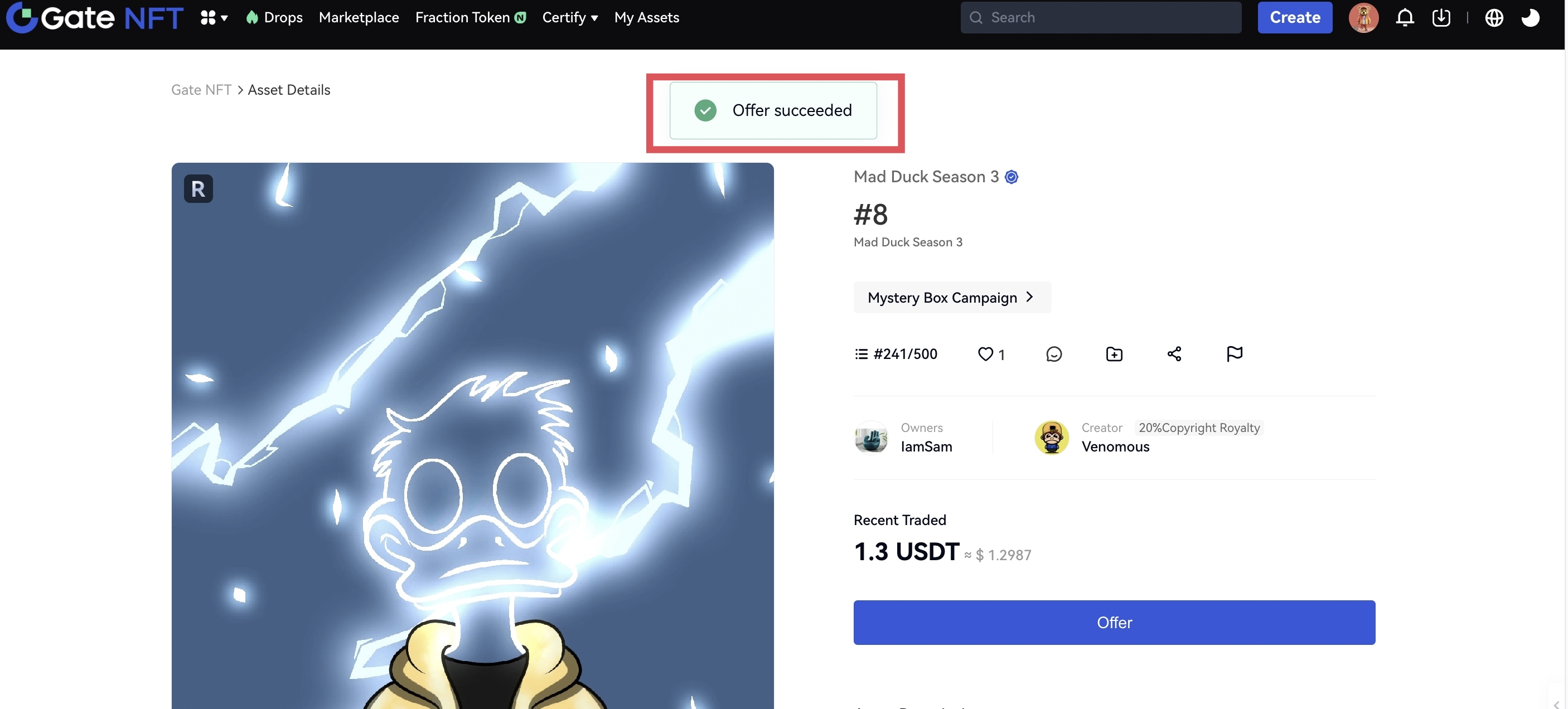 Após a aceitação da oferta pelo proprietário, você pode acessar a página “Meus Ativos” para visualizar o NFT que você adquiriu. Parabéns, você agora é o proprietário do NFT.