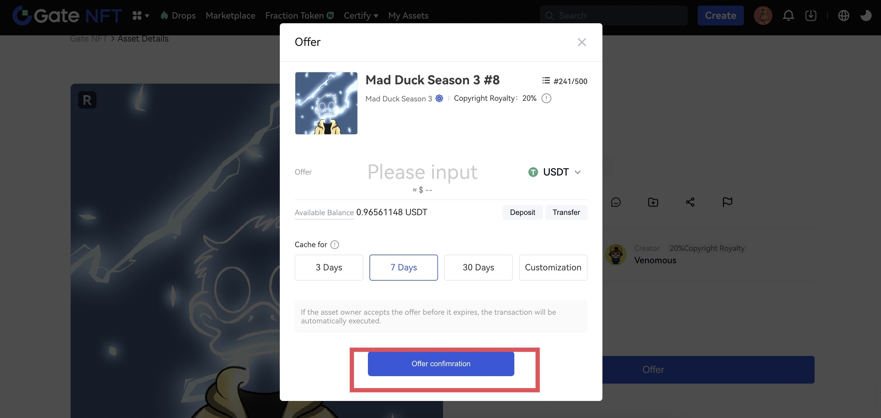 Período de validade: O período de validade da sua oferta pode ser definido como 3 dias, 7 dias ou 30 dias, ou você pode personalizar um período de validade. Se o proprietário do ativo não aceitar a oferta antes do término da validade, a oferta será automaticamente cancelada e os fundos bloqueados serão devolvidos à sua conta spot. A oferta pode ser cancelada a qualquer momento antes da data de expiração e qualquer oferta cancelada se tornará automaticamente inválida.