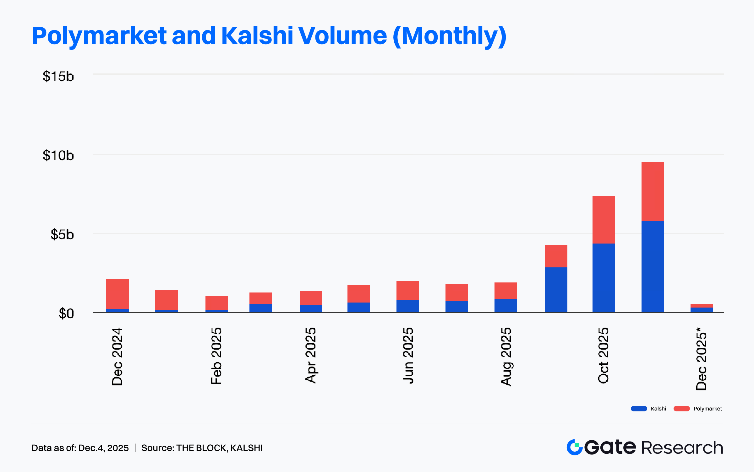 Em novembro, o volume negociado da Kalshi subiu de US$4,4 bilhões em outubro para US$5,8 bilhões (+32%). O volume da Polymarket também aumentou de cerca de US$3,02–US$3,04 bilhões para mais de US$3,74 bilhões (+23,8%). Juntas, movimentaram quase US$10 bilhões, tornando novembro o mês mais forte da história dos mercados de previsão cripto.