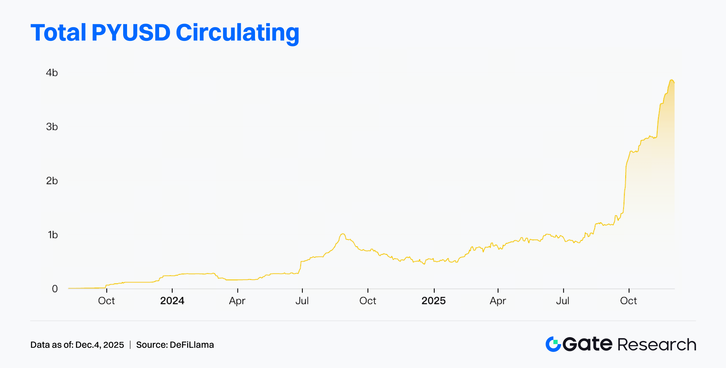 A PYUSD da PayPal apresentou crescimento expressivo de oferta, indo na contramão do mercado. Sua capitalização saltou de US$1,2 bilhão para cerca de US$3,8 bilhões em dois meses (setembro a novembro de 2025), com aumento de mais de US$1 bilhão só em novembro. PYUSD ultrapassou USD1, tornando-se a sexta maior stablecoin global, resultado de estratégias da PayPal.