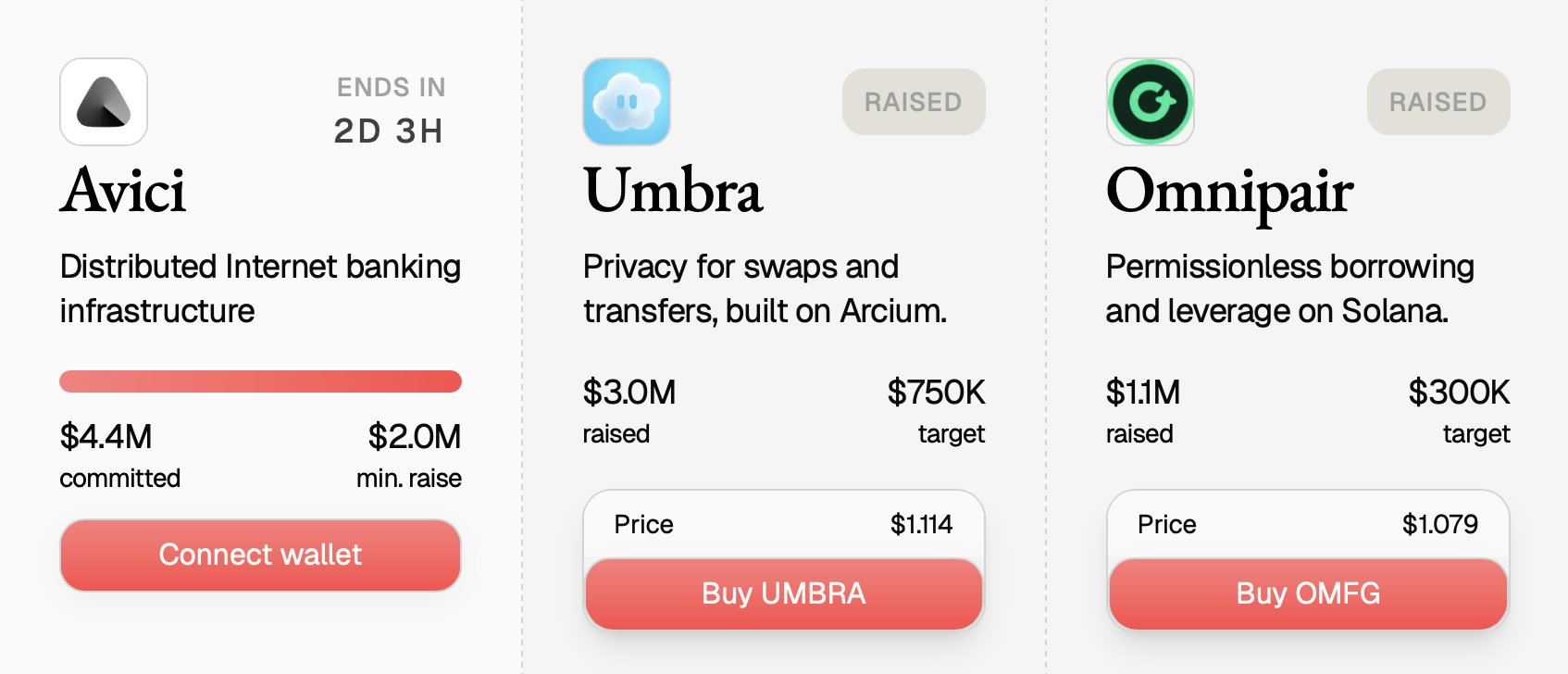 O caso de destaque foi Umbra, protocolo de privacidade Solana. A venda atraiu mais de 10.000 participantes e superou US$150 milhões em compromissos, exibindo dados de tickets ao vivo na página. Essa transparência mostrou como pode ser o futuro dos ICOs: on-chain, estruturado, com políticas claras.