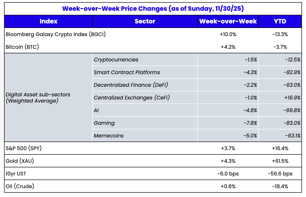 O mercado de ativos digitais registrou queda em 7 das últimas 8 semanas, mas ensaiou uma breve recuperação na semana do Dia de Ação de Graças, só para despencar novamente no domingo à noite com a abertura dos mercados japoneses (Nikkei em baixa, juros dos títulos japoneses em alta). Embora a queda inicial das criptomoedas tenha ocorrido após a interrupção da Binance e de outras exchanges em 10 de outubro, três semanas antes da reunião do FOMC, a maior parte da fraqueza em novembro foi atribuída (ex post) aos comentários agressivos do presidente do Fed, Powell. As expectativas de corte de juros em dezembro despencaram durante novembro, de quase 100% para cerca de 30%. Isso pressionou os mercados de ações e cripto ao longo do mês.