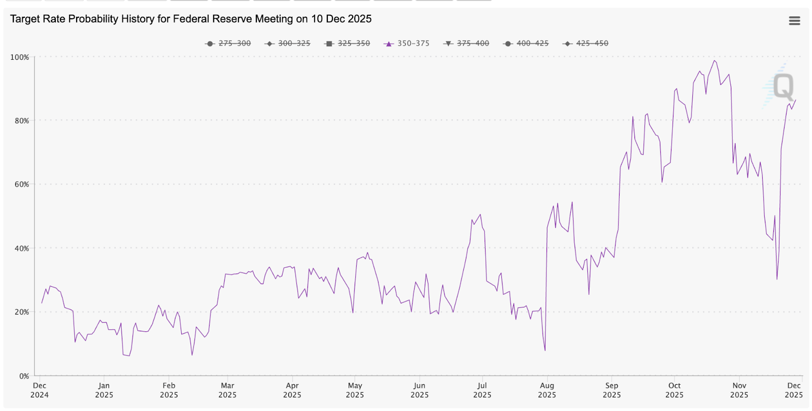 No entanto, algo inusitado ocorreu na última semana de novembro. A inflação do núcleo do PPI caiu para 2,6%, abaixo da expectativa de 2,7%, e os poucos dados disponíveis sobre o mercado de trabalho após a paralisação do governo indicam desaceleração, se não colapso. As expectativas de corte de juros para dezembro rapidamente voltaram a quase 90%, e as bolsas tiveram uma alta expressiva, encerrando novembro no azul. Além disso, Trump deu indicações de que já sabe quem será o próximo presidente do Fed, e os mercados de previsão praticamente precificam totalmente Kevin Hassett, conhecido por defender cortes de juros mais rápidos em sintonia com o governo Trump, sendo amplamente visto como otimista em macroeconomia.