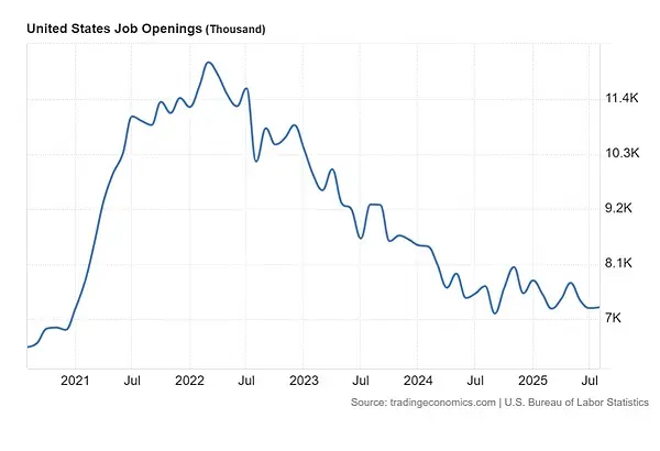 就连“七巨头”也预测盈利增长将会放缓,主要原因是人工智能领域的巨额投入。Meta和亚马逊的利润预计将会大幅下滑,几乎降至零。至于劳动者,劳动力市场持续疲软,新增就业岗位正在减少。