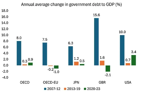 21世纪公共部门债务大幅上升的原因在于:2008-2009年全球金融危机期间对金融和私营部门的救助、2012年之前的欧元区债务危机,以及为帮助民众度过2020年疫情冲击而提供的财政支持。在这些时期,政府债务比率飙升。而在两者之间的时期,紧缩政策(特别是削减福利和基础设施投资)以及经济增长的一定程度的复苏,使得债务比率基本保持稳定。与此同时,个人所得税(特别是针对高收入群体)和企业所得税的削减,使得政府税收收入占GDP的比重保持在35%左右的水平,而政府支出占GDP的比重则有所上升(国际货币基金组织数据)。