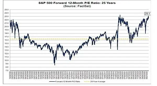但一切真的如此美好吗?股市繁荣已将股票价格与公司盈利的比率推至新高。市盈率(P/E ratio)目前比历史平均水平高出约40%,甚至超过了2000年所谓的“互联网泡沫”时期的水平。而那场泡沫破裂时,市盈率也下跌了40%。