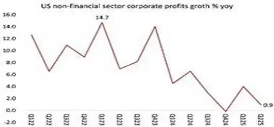 我在之前的文章中指出,美国的成功几乎完全归功于科技巨头对人工智能的持续投资,这些巨头也因此获得了巨额利润。但美国其他企业经济却陷入低迷。在企业领域,盈利仍在增长,但增速放缓,预计到2024年底将同比增长超过18%,而到2025年第三季度,增速仅为10.7%——虽然仍然不错,但呈下降趋势。