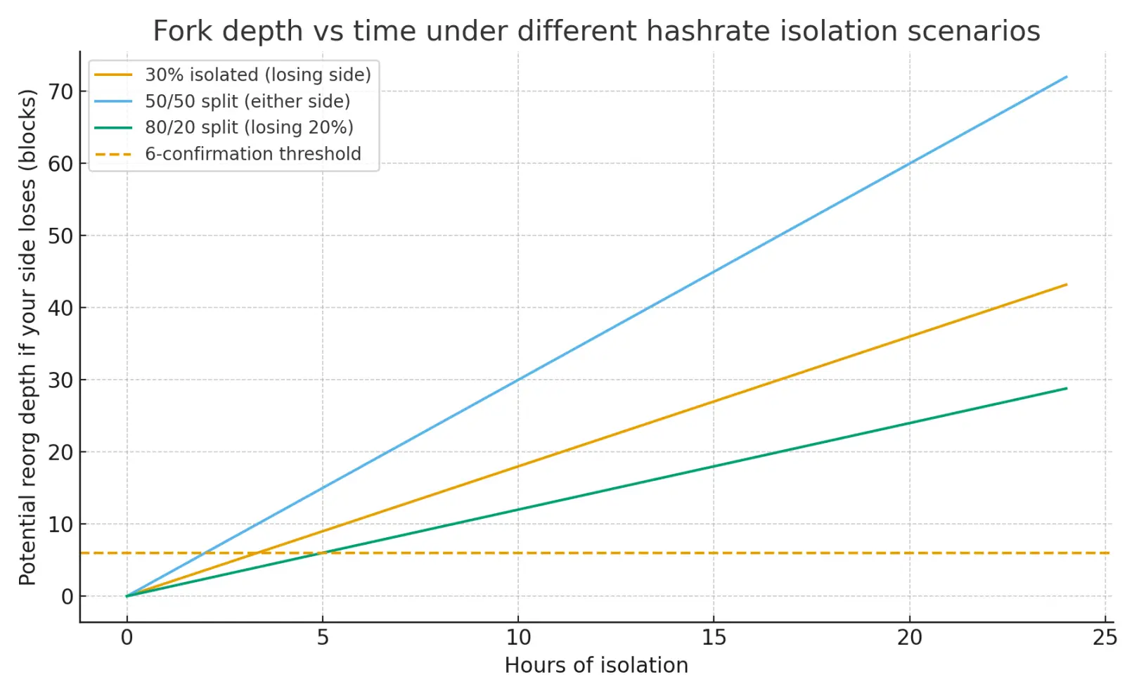 • 30% 哈希率被隔离时,少数派分区每小时约产出 1.8 个区块。这意味着该分区内标准的 6 次确认支付,在约 3 小时 20 分钟后会面临失效风险 —— 若其余 70% 的网络构建出更长链条,这 6 个区块可能被孤立。