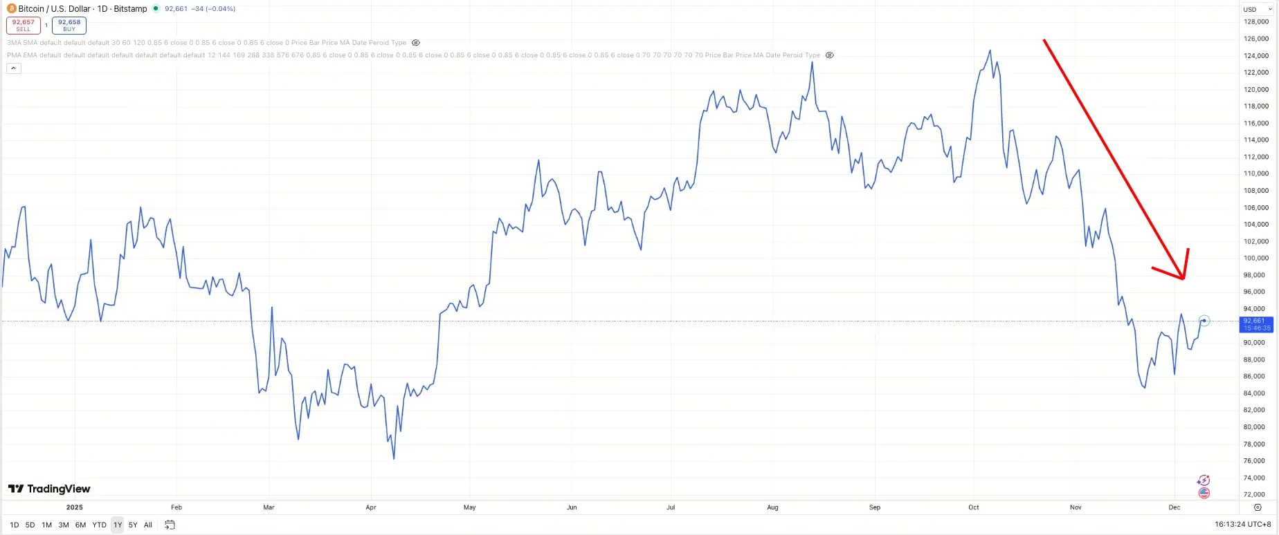 O Bitcoin corre o risco de terminar o ano inteiro em baixa pela primeira vez desde 2022, depois de ter registado máximos históricos e uma forte queda em 2025. Depois de atingir um máximo histórico de 126.000 dólares no início de outubro, Trump anunciou novas tarifas sobre importações chinesas a 10 de outubro, desencadeando a liquidação forçada de mais de 190 mil milhões de dólares em posições alavancadas em criptomoedas, estabelecendo um recorde para a maior liquidação da história das criptomoedas.