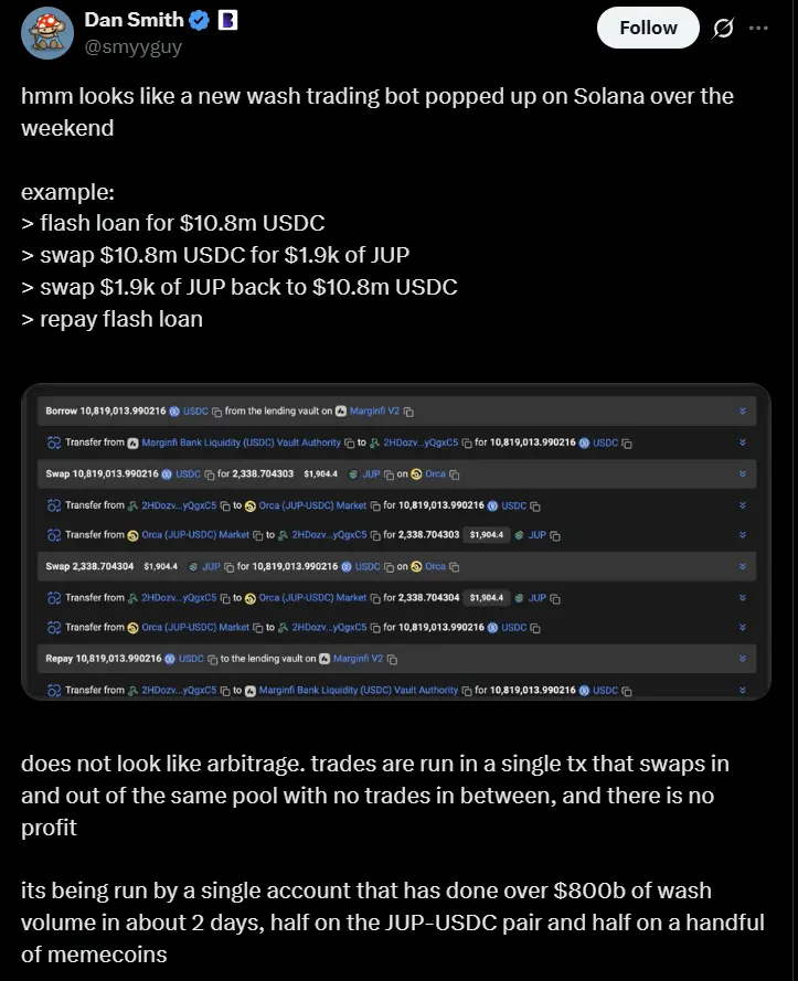 Source:Dan Smith Recentemente, relatos de traders e analistas apontaram para um aumento de suspeitas de wash trading em exchanges descentralizadas na Solana.