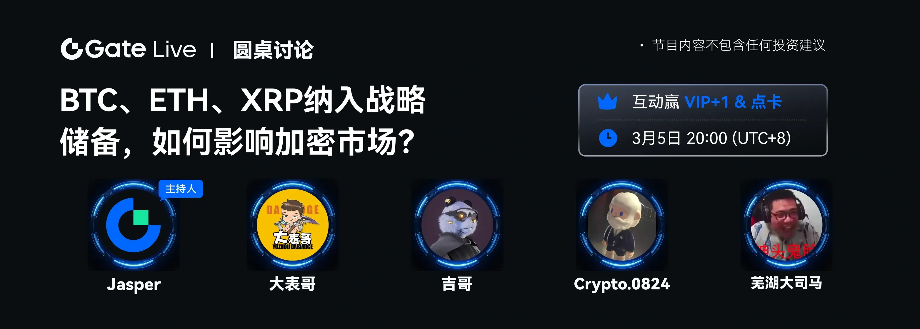 O gateLive realizará uma transmissão ao vivo da “Mesa Redonda” no dia 5 de março às 20:00 (UTC+8). Convidaremos quatro pesquisadores de blockchain para dar uma olhada aprofundada no Programa de Reserva Estratégica dos EUA e outros eventos macro importantes da semana, bem como discutir estratégias de resposta ao mercado. Assista à transmissão ao vivo e receba airdrops gratuitos na sala de transmissão ao vivo**:
