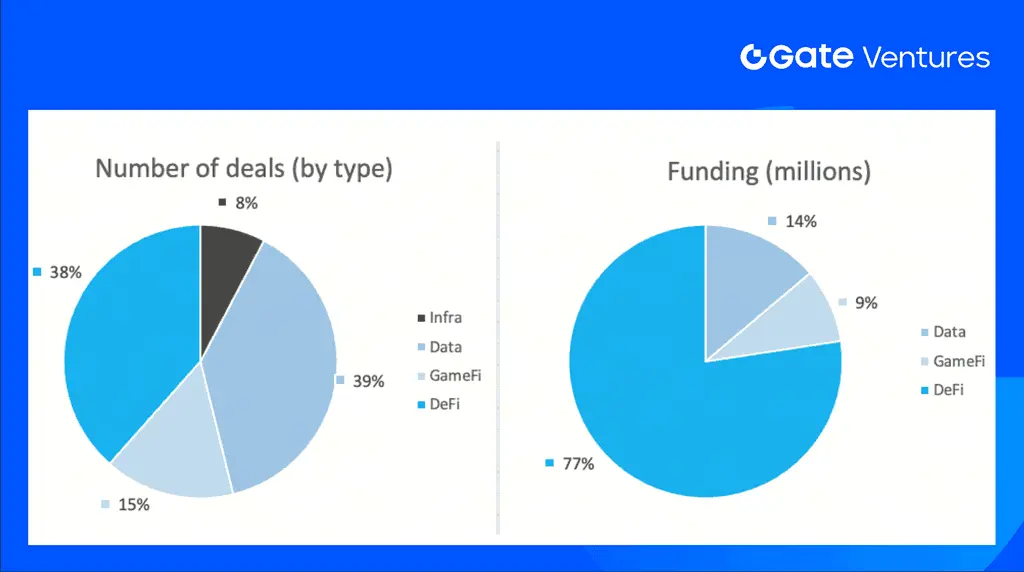 O número de negócios fechados na semana anterior foi de 13, com Data tendo 5 negócios, representando 38% para cada setor do número total de negócios. Enquanto isso, Infra teve 1 (20%), Gamefi teve 2 (15%) e DeFi teve 5 (38%) negócios.