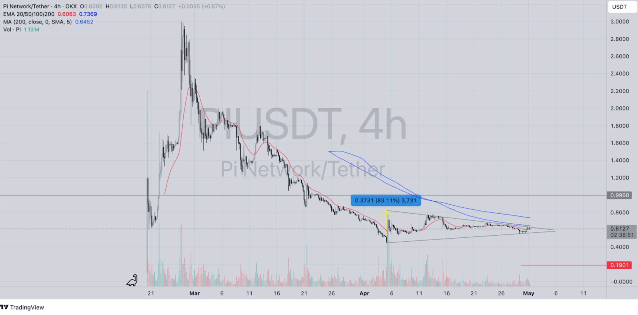 Чарт Pi Network/Tether (PI/USDT) ниже показывает симметричный треугольник на 4-часовом таймфрейме. С начала апреля активность цены PI, похоже, консолидируется в пределах симметричного треугольника, выделенного сходящимися трендовыми линиями. Этот паттерн обычно указывает на период неопределенности на рынке, когда давление покупки и продажи почти сбалансировано.