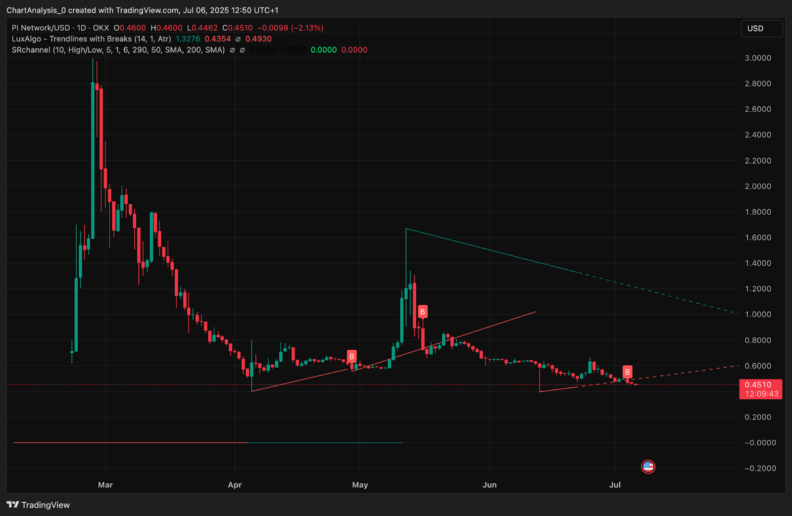 Смотря в будущее, цена Pi должна удержаться на уровне поддержки 0.44 доллара до 0.442 доллара, чтобы избежать падения до 0.40 долларов. Если эта поддержка будет пробита, следующей целью нисходящего тренда может стать 0.395 долларов, где сосредоточатся предыдущие BOS и низкие объемы торгов. С положительной стороны, восстановление до 0.465 долларов станет первым признаком разворота тренда, дальнейшие целевые уровни будут около 0.48 и 0.50 долларов.
