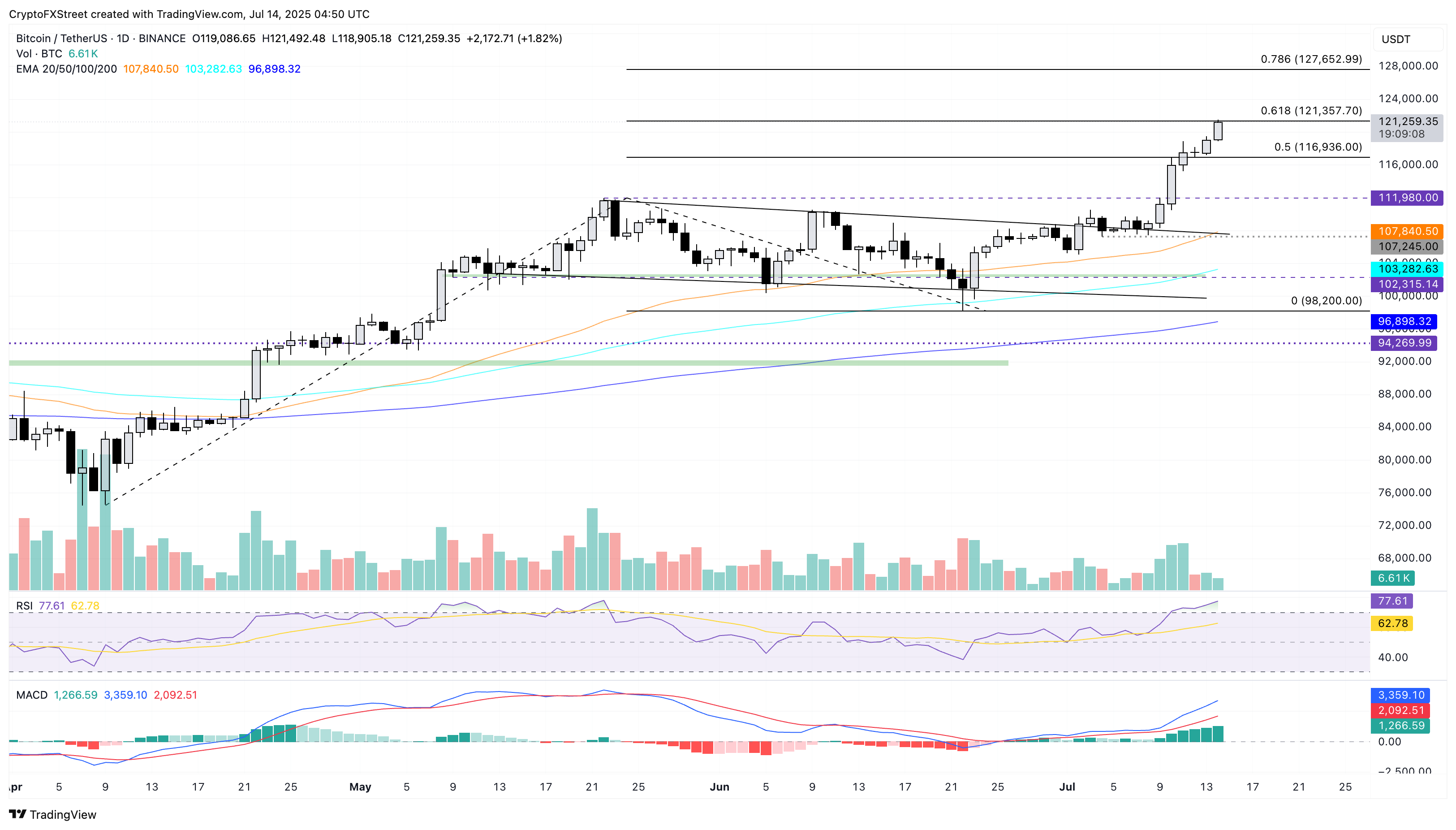 Аналитик FXStreet Вишал Диксит заявил, что по состоянию на момент публикации в понедельник Биткойн незначительно вырос почти на 2%, преодолев неизвестный уровень выше 121,000 долларов. Ралли Биткойна ставит под сомнение уровень коррекции Фибоначчи 61.8% на 121,357 долларов, который сформирован от минимума 74,508 долларов 7 апреля до максимума 111,980 долларов 22 мая.