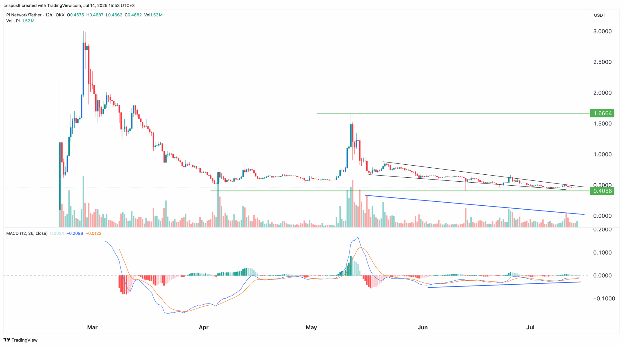 Цена токена PI формирует двойное дно на уровне 0.4056 долларов, линия шеи находится на уровне 1.6664 долларов, что является максимумом мая. Тот же токен также сформировал нисходящий клин, что является распространенной бычьей разворотной моделью. Две линии клина скоро соединятся, что может привести к прорыву.