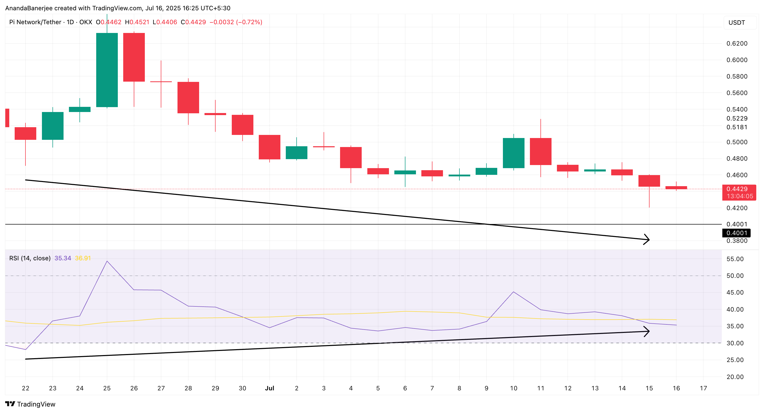 Цена Pi монеты продолжала достигать новых минимумов с конца июня до 15 июля, но индикатор отслеживания импульса RSI формирует новые минимумы. Это несоответствие обычно указывает на то, что, хотя цена кажется слабой, покупательский интерес потихоньку накапливается.
