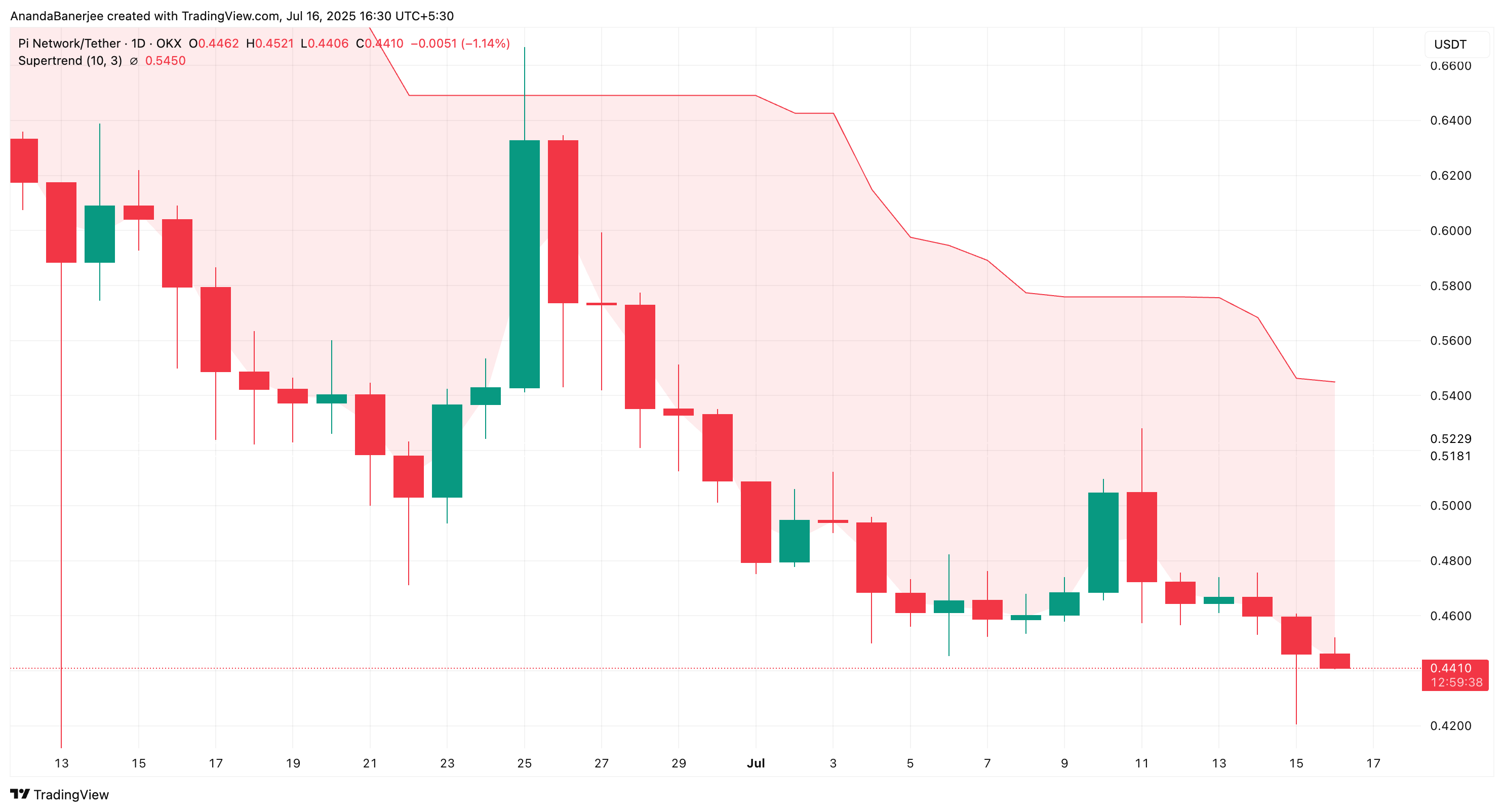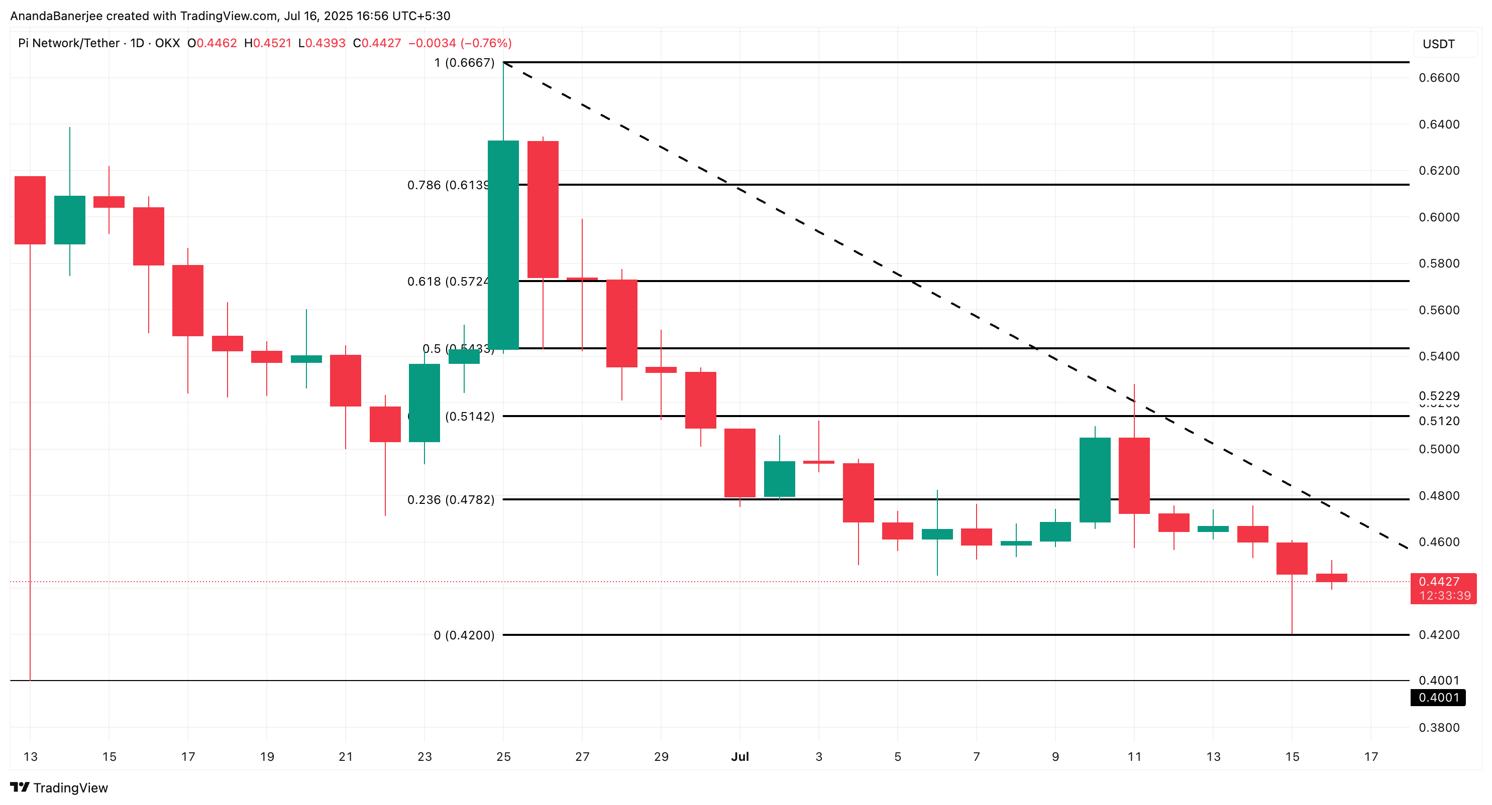 Если посмотреть на структуру цены, то Pi упал ниже уровня 0,23 по Фибоначчи ($0,47) и в настоящее время консолидируется около $0,44. Следующая крупная поддержка находится на уровне $0,42, и если она опустится ниже нее, рынок может упасть еще на 10% от текущих уровней.